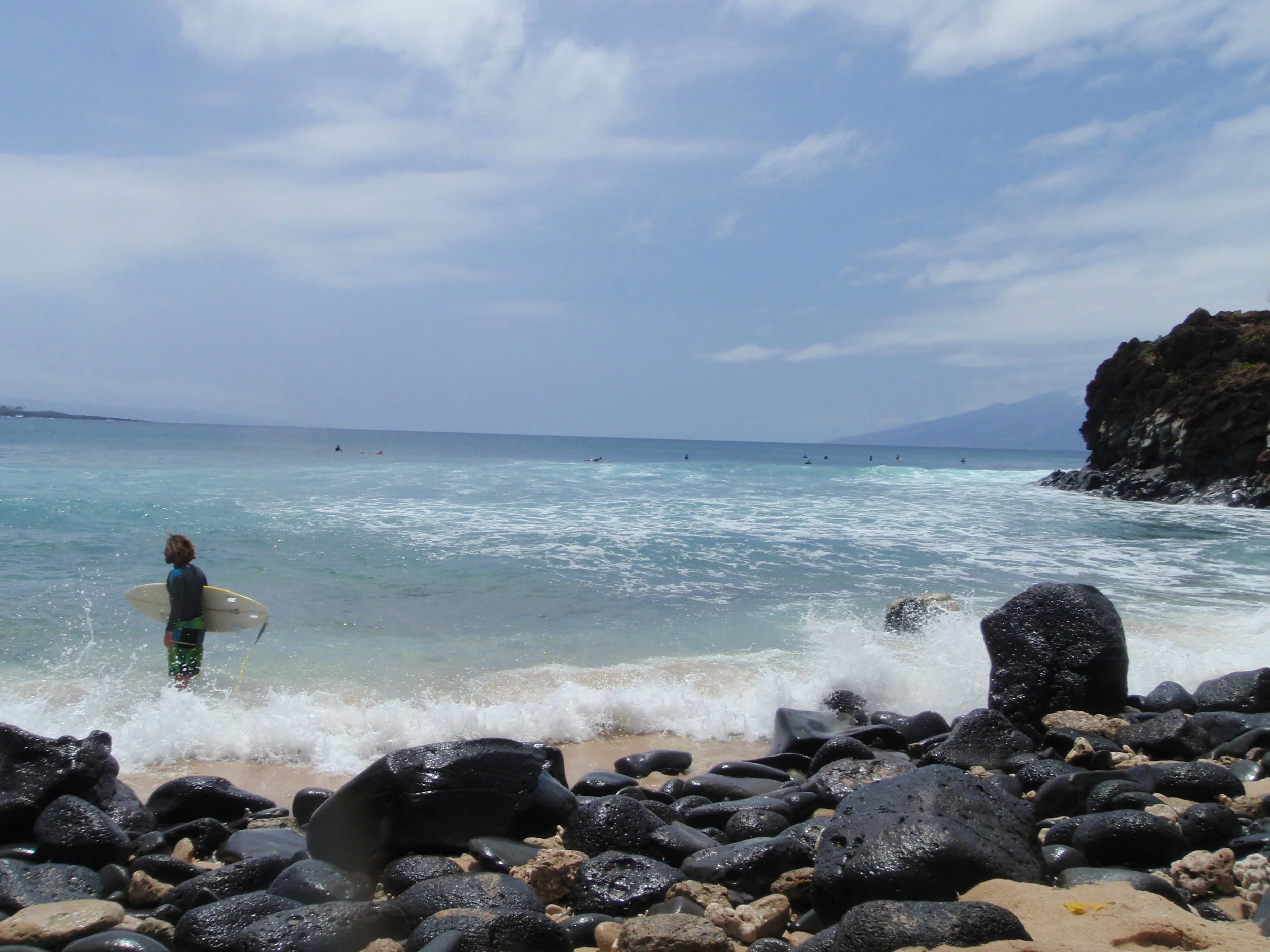 If you're comfortable surfing, head to Olowalu on the west side for steady waves that aren't too small but not too big. This is the black and white stone beach I mentioned earlier. There's no beach park or parking lot, you just park on the side of the road.