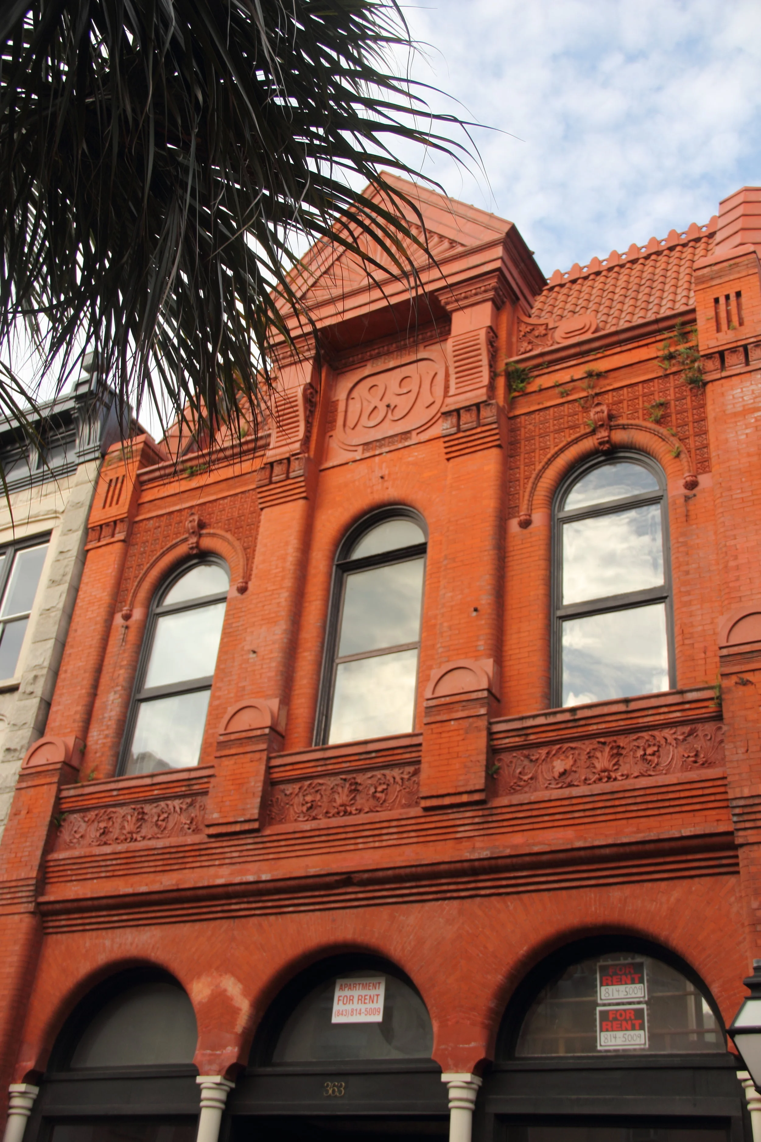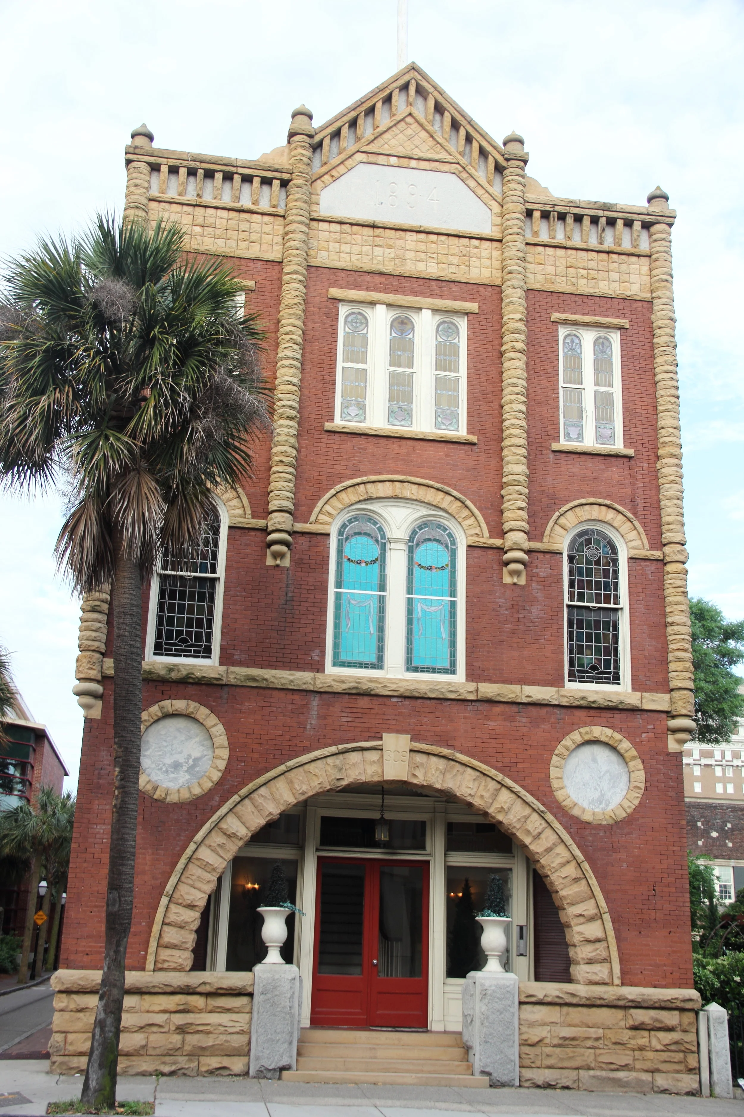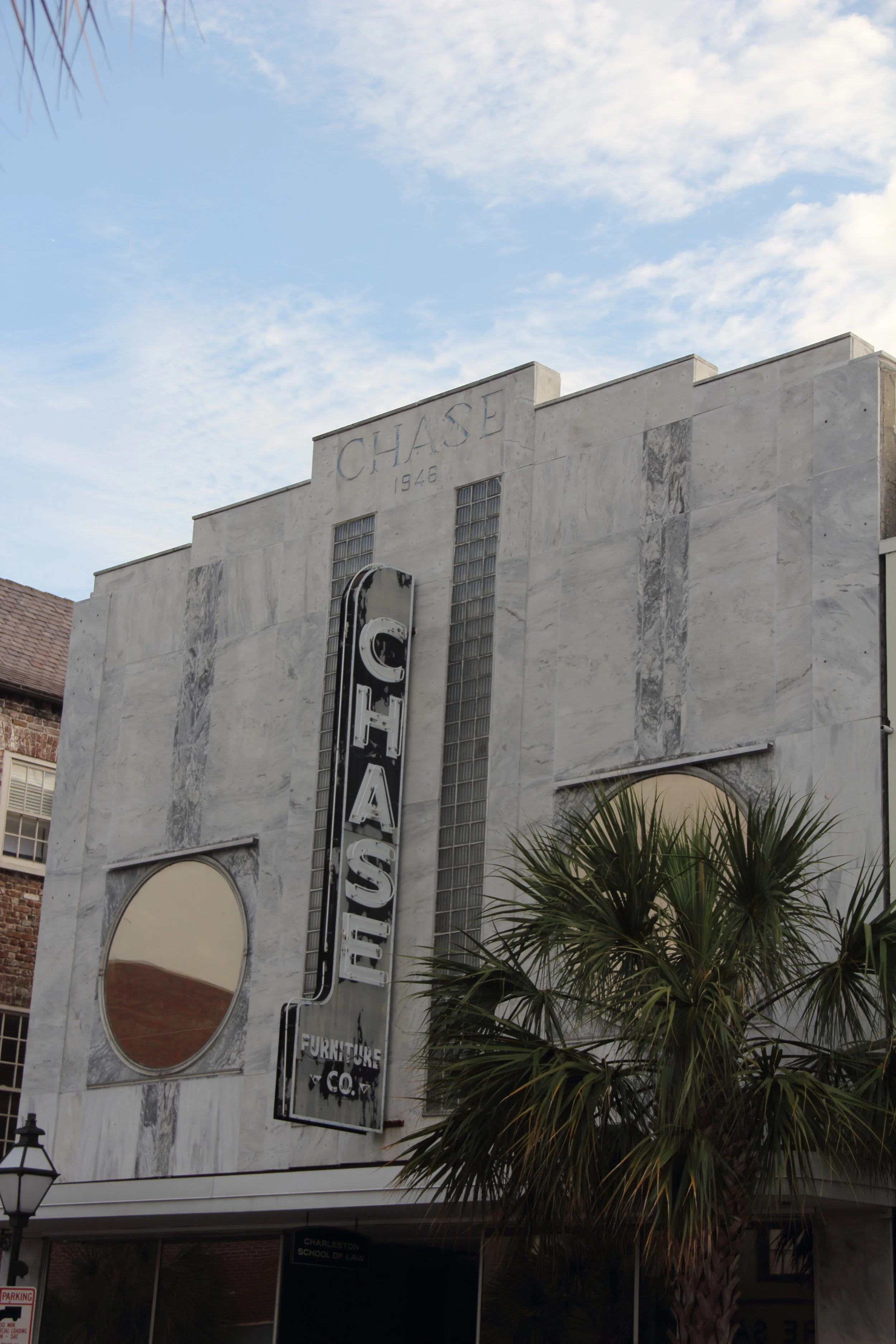 Chase Furniture Company, designed by Augustus Constantine, is one of my favorites on King Street. The clean lines, monochromatic colors and large reflective windows, make it a standout among the colorful facades on the street. The building, constructed in 1946, housed Chase Furniture until 2005. In 2007, the Charleston Law School began a lease and remains there today. (Via)