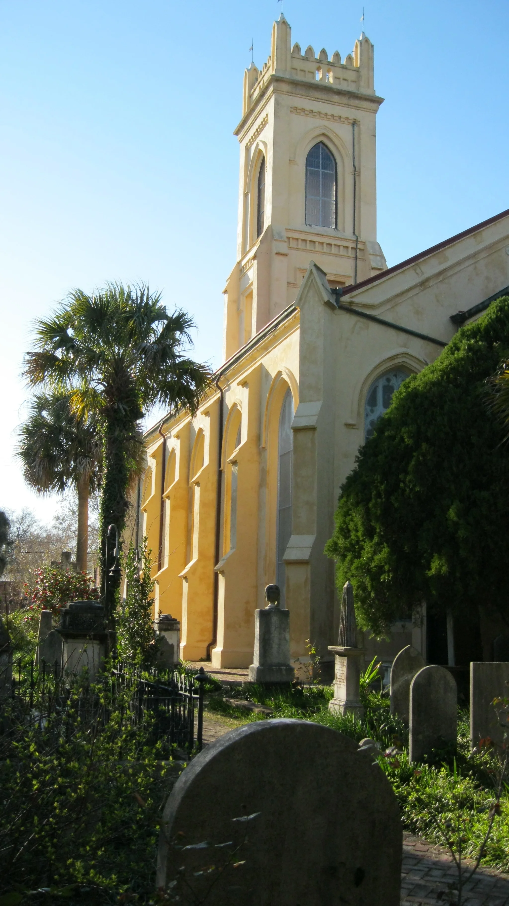 Charleston architecture is dominated by historic churches throughout the city giving it its nickname, the Holy City. The Unitarian Church is the oldest in the South and the second oldest church in downtown Charleston. Its construction began in 1772 when the congregation decided it needed more space than its Meeting Street location could provide. It was nearly complete in 1776 when the Revolutionary War began, finally being repaired and officially dedicated in 1787. The church was declared a National Historic Landmark in 1973. The entrance for the church is on Archdale Street, but there are two brick and iron gates leading into the picturesque cemetery from King Street. It is a literal hidden gem right on King Street. You can read more about the first time I wandered into their churchyard here.