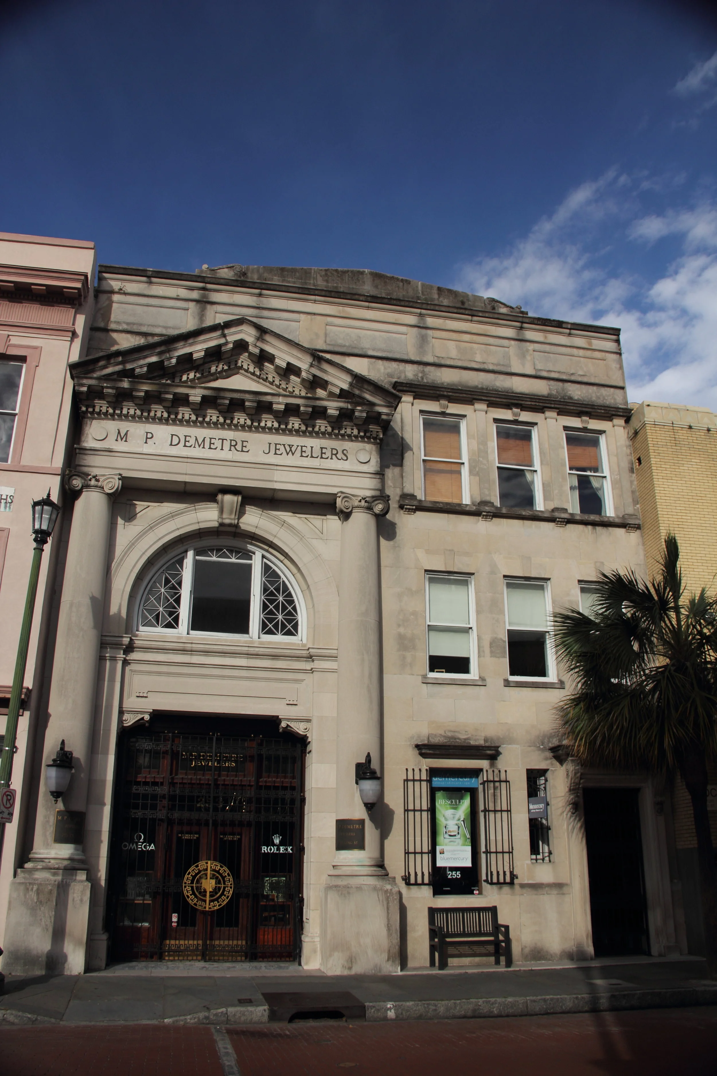 The Liberty & Citizens' Bank building at 253 King Street was built in 1914 by John Darlington Newcomer. He was known as the "dean of Charleston architects" for his extensive work in Charleston during the turn of the twentieth century. In 1980 the building became home to M.P. Demetre Jewelers. (Via)