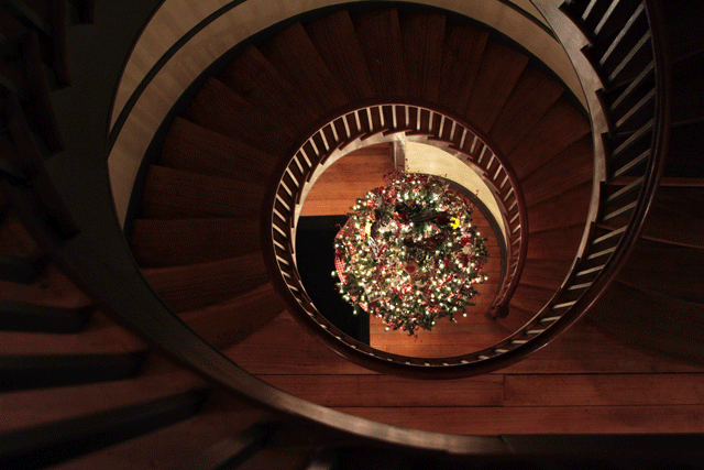 Don’t miss the incredible staircase view from the top floor in the Trustee House. Climb up the stairs after dinner to see the Christmas tree from a whole new perspective.