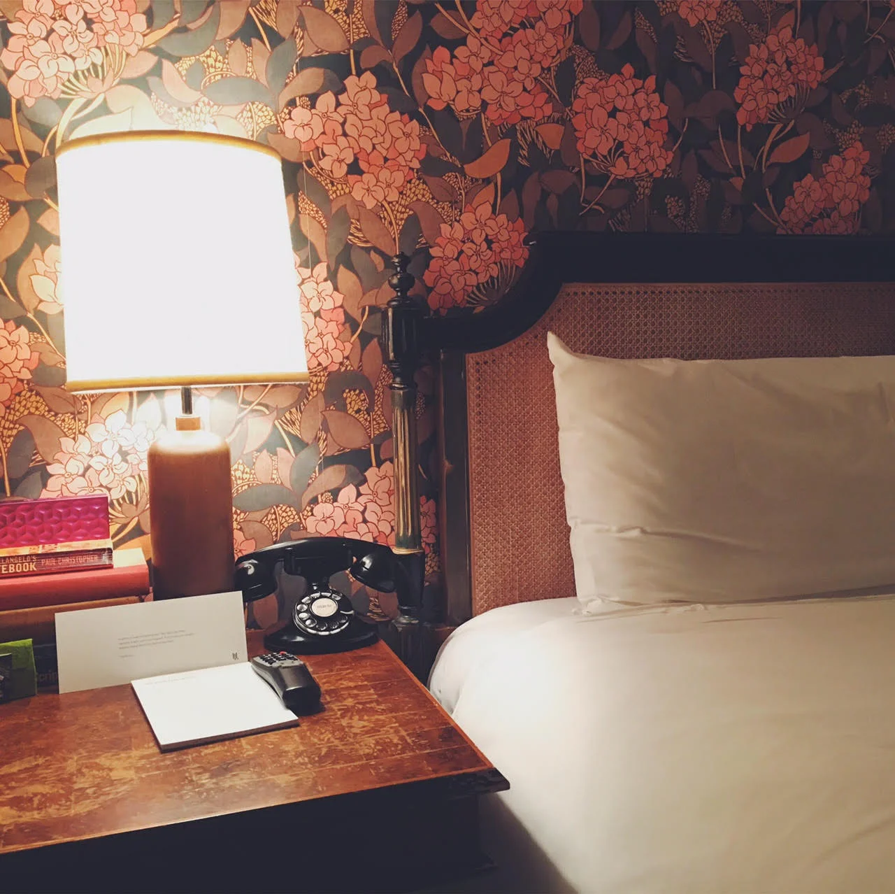 After checking in, we made our way to our rooms. SWOON. The nature of the historic building creates unique rooms throughout the hotel. Each one is a little different and furnished with one of a kind antiques collected at markets from around the United States. The bedside table is furnished with a restored rotary phone from the 1920s, vintage books, and terrarium filled with succulents. My favorite part of the room was the small writing desk, and mine was perfectly placed beneath the large casement windows. On the desk you'll find a vintage custom embosser.